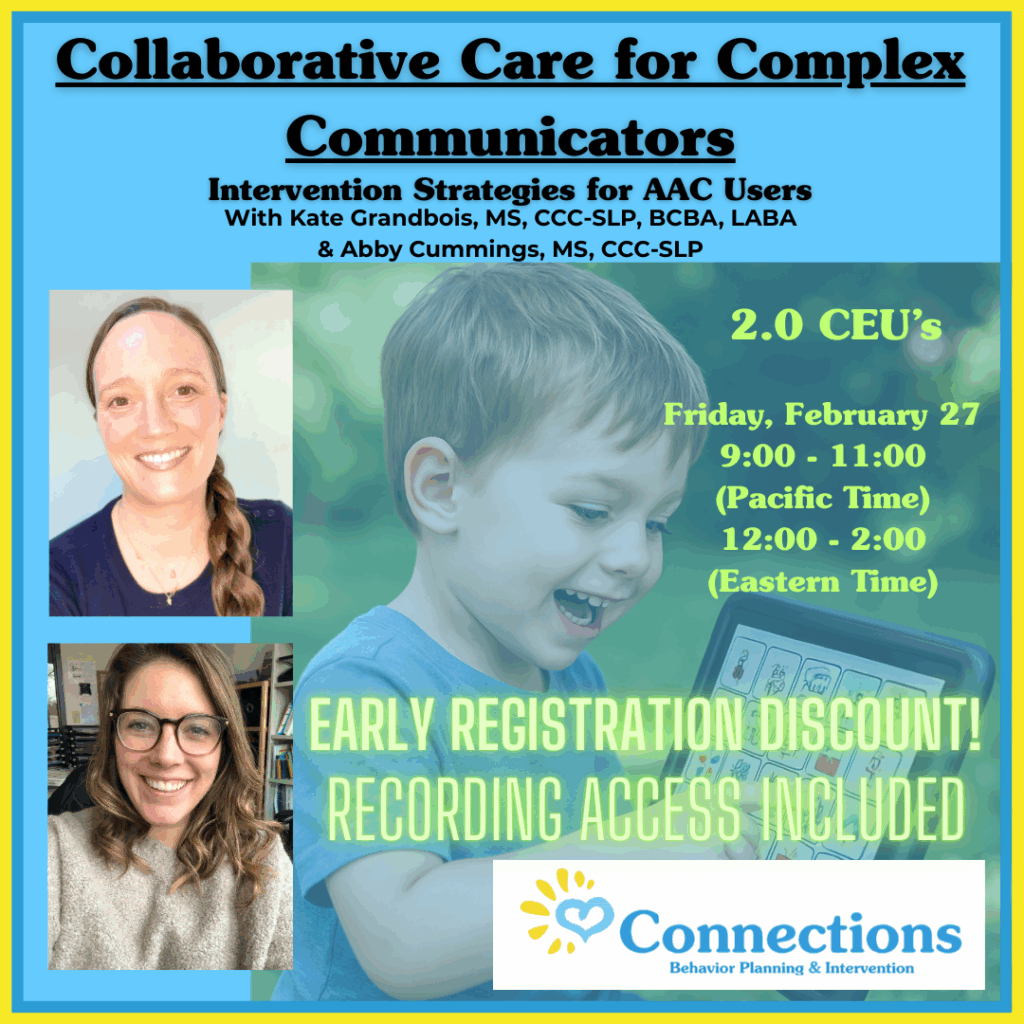 - Connections Behavior Planning and Intervention welcomes Kate Grandbois, BCBA, and Abby Cummings, SLP, for an online webinar on intervention strategies for AAC users.
