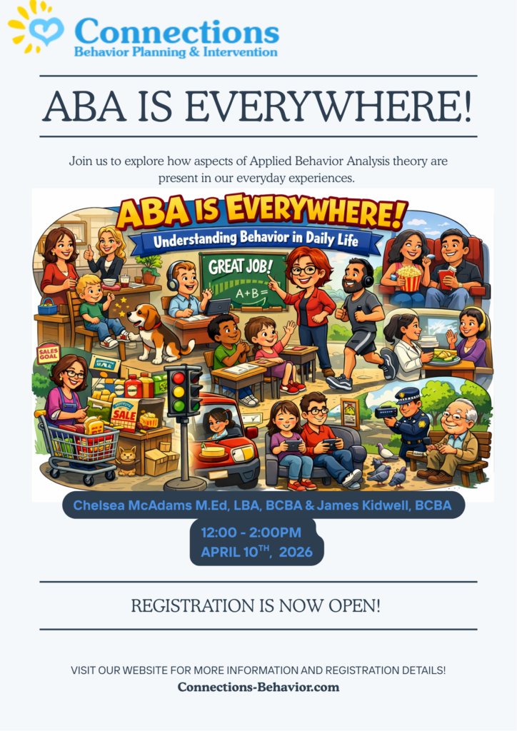 - Connections Behavior Planning and Intervention welcomes James Kidwell, Chelsea Mcadams , BCBA, for an online webinar on using ABA in everyday life.